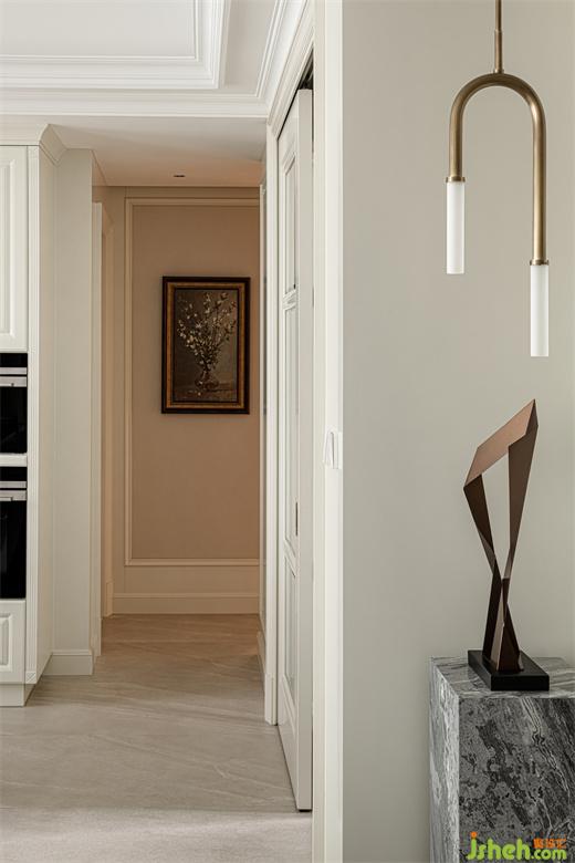 門廳柜體的花束墻紙別具古雅自然氛圍,與空間的典雅格調(diào)相得益彰。立在一旁的抽象幾何雕塑為空間更增幾筆藝術(shù)魅力。