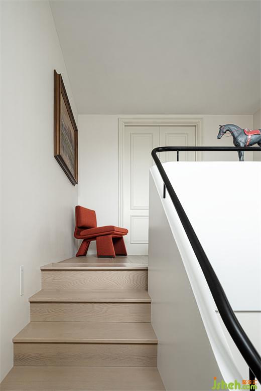 二樓走廊的墻壁上掛著業(yè)主收藏的俄羅斯藝術(shù)油畫(huà),畫(huà)面中的森林河流與山巒紅日,亦動(dòng)亦靜,家裝設(shè)計(jì)營(yíng)造出一種清朗遼遠(yuǎn)的自然意境,壯美之余,流露出生命的力量與希望。