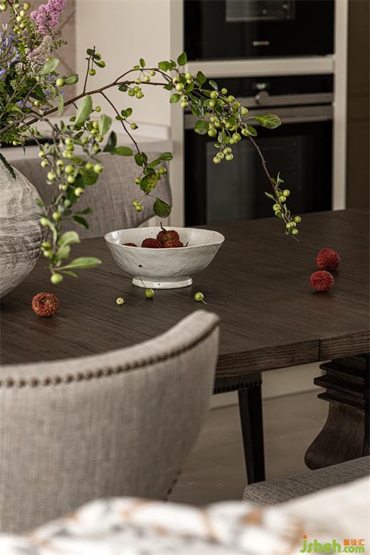 餐廳白色與金色相間的吊燈,華而不艷,上方樹(shù)枝造型遒勁硬朗,渲染出整個(gè)空間的自然氛圍。餐桌上古樸陶罐插滿生機(jī)勃勃的枝葉與花束,為用餐氛圍注入了更多的自然與活力。