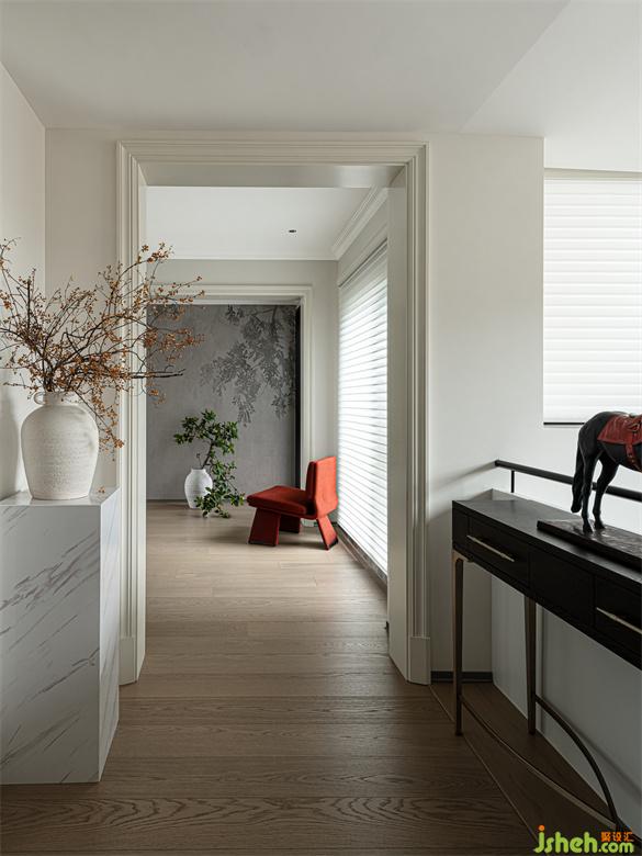 走廊一側(cè)的展示架上,擺放著精心挑選的馬形雕塑,靜謐之中又包蘊(yùn)著一種爆發(fā)力,為整個(gè)走廊增添了更多的藝術(shù)張力。植物的穿插渲染,蔥郁盎然,流露出鮮活的生氣。