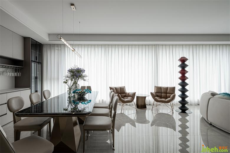 餐廳延續(xù)空間的主色調(diào),餐桌別具設(shè)計(jì)個(gè)性,黑色理石桌面與黃銅相結(jié)合,加上黃銅桌腿別出心裁的厚重造型,家裝設(shè)計(jì)都讓餐廳充滿了現(xiàn)代時(shí)尚的典雅氛圍。