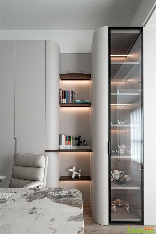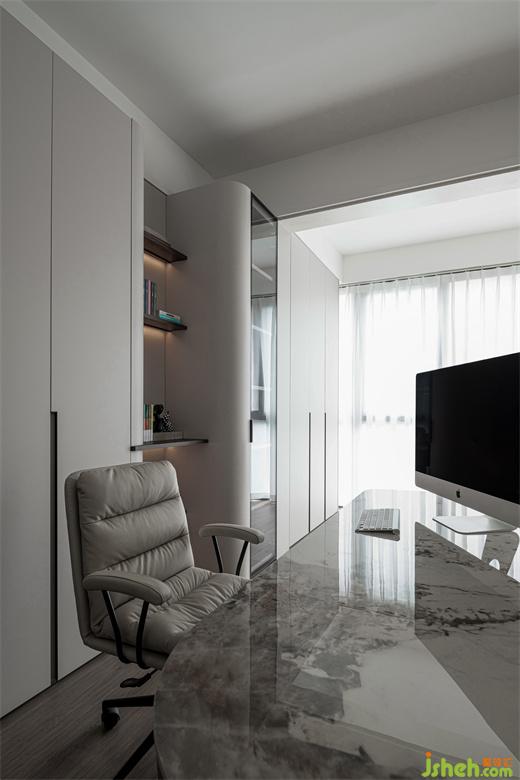 書房以淡雅的灰色作為主色調(diào),給人一種溫暖平靜之感,溫潤(rùn)的弧度更增造型之美。寬大舒適的書桌放置在房間中央,加上一把柔軟的靠背椅,為人專注的工作學(xué)習(xí)提供了理想的場(chǎng)所。