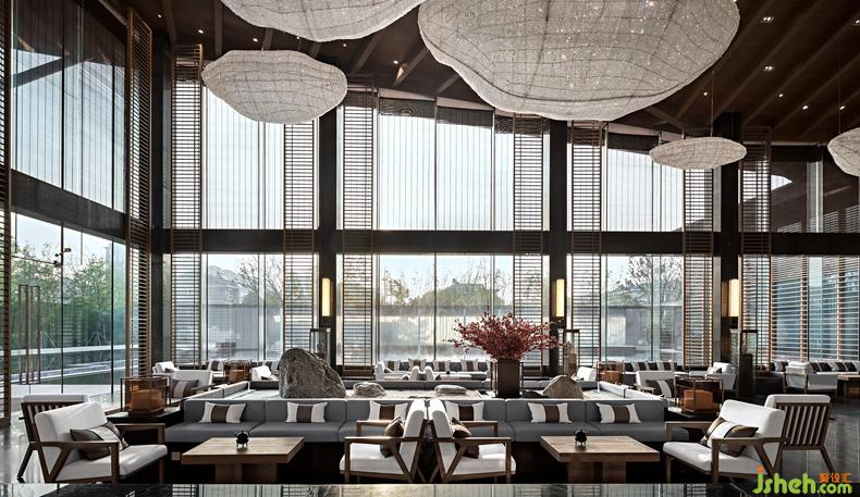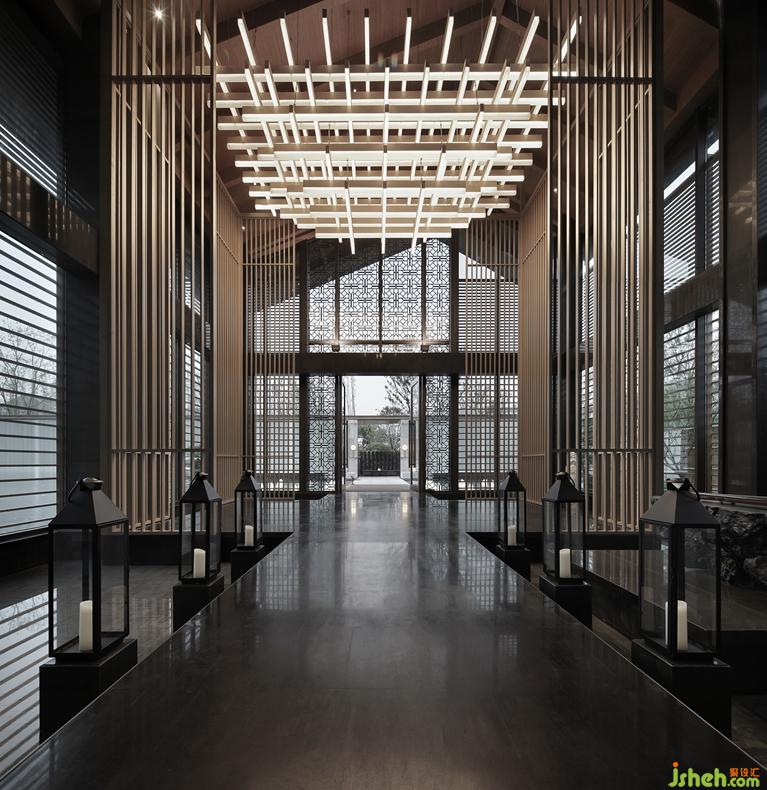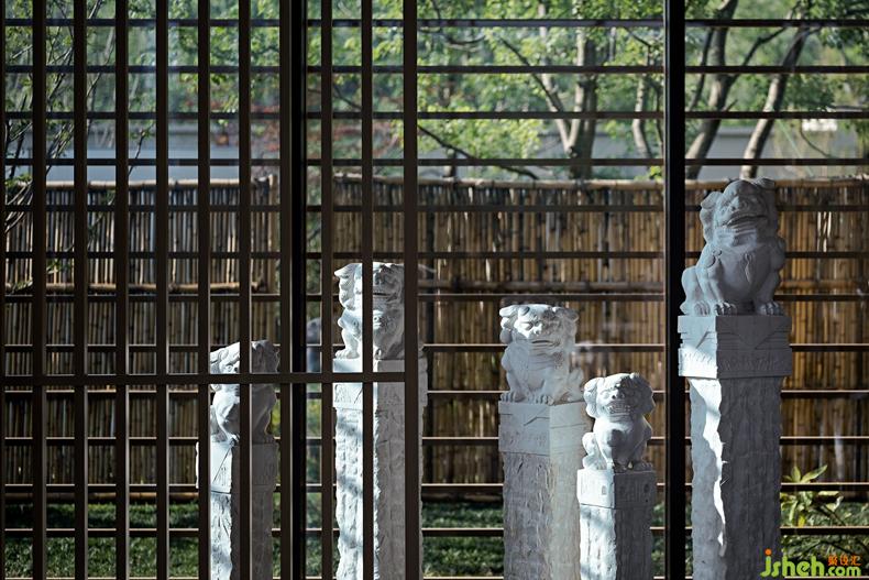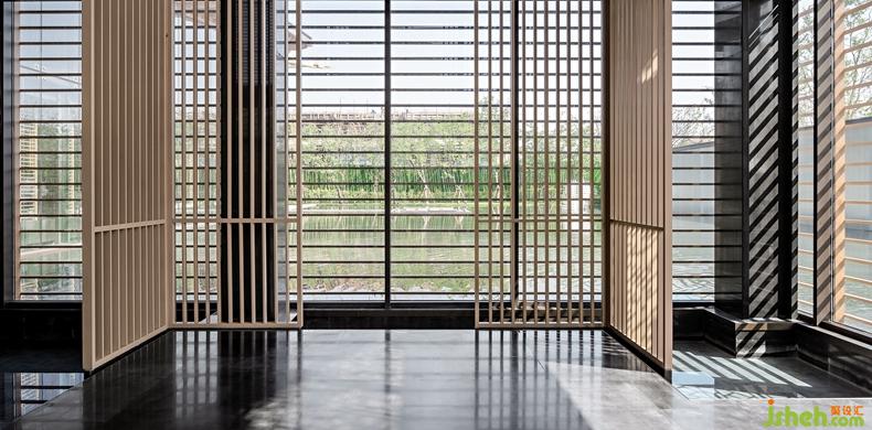 藝術(shù)家從無界的時(shí)空痕跡里捕捉靈感,設(shè)計(jì)師基于骨子里的東方人文基因,提取淬煉出對(duì)中式經(jīng)典美學(xué)的贊美與傳承。坡屋頂是中國傳統(tǒng)建筑的代表元素,尚石設(shè)計(jì)在這個(gè)空間里用建筑的手法打造了室內(nèi)水榭,以人文詩意的精神聯(lián)動(dòng)室內(nèi)外,為空間賦予了更豐富的文化特性。鋁格柵裝置讓室內(nèi)外依然保持互動(dòng),呈現(xiàn)出自然通透的空間感。