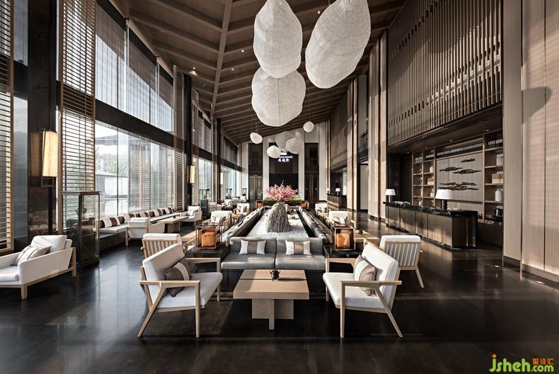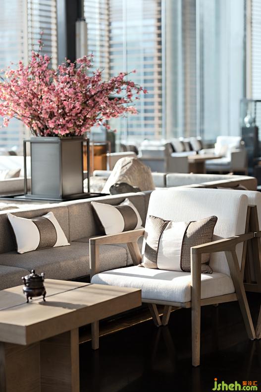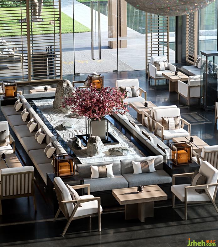 Only the brief design could present a quiet and natural artistic prospect. So the designer takes the central landscape as the center, and settles several groups of natural and simple furniture in negotiation area. The visiting guests by the window can sit here with hills, rivers and a good mood. There are not so many decorations but blue and white porcelain and small incense burner properly decorated. Walking out from indoor, a set of sunken outdoor sofa penetrates into the boundless waterscape, it seems that you are in a boat, and isolated from the secular world, only can feel the charm of nature.