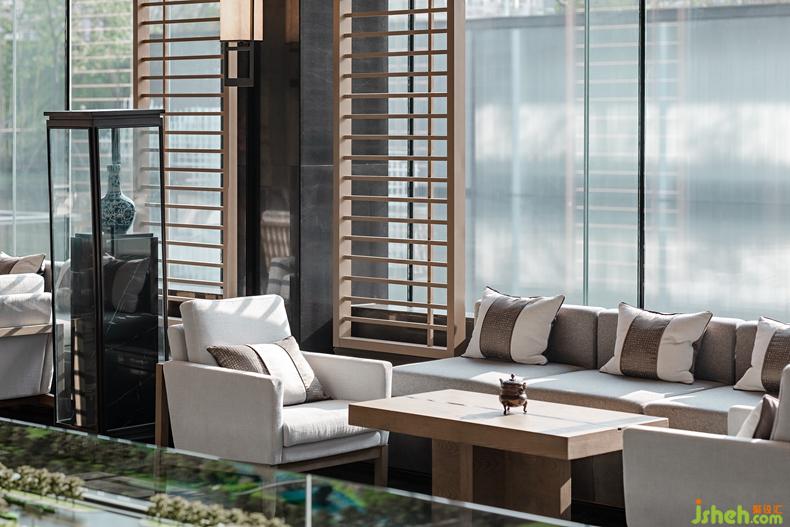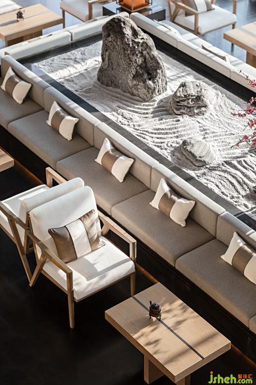 營(yíng)造靜謐自然意境,設(shè)計(jì)當(dāng)做減法。以空間中央的枯山水為中心,幾組自然質(zhì)樸的家具形成洽談場(chǎng)景空間。在靠窗的位置,來(lái)訪的客人面山背水而坐,心生親切。青花瓷、小香爐適當(dāng)點(diǎn)綴,并無(wú)過(guò)多裝飾。從室內(nèi)行至室外,一組下沉式的戶(hù)外沙發(fā)深入無(wú)邊界的水景中,渾然一體,宛若行舟至此,與俗世隔絕,只待靜靜感受大自然的魅力。