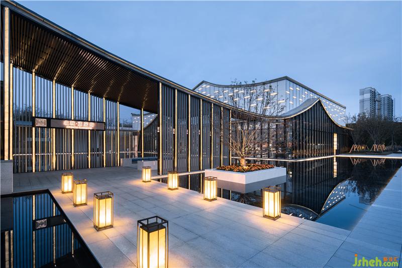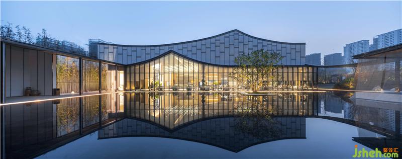 設(shè)計師從徽派建筑的瓦當(dāng)這個傳統(tǒng)的建筑構(gòu)件中提煉出其形,結(jié)合了建筑的人字形設(shè)計,采取了比較柔和的連續(xù)弧形‘人’字形屋頂結(jié)構(gòu),形成一個整體。