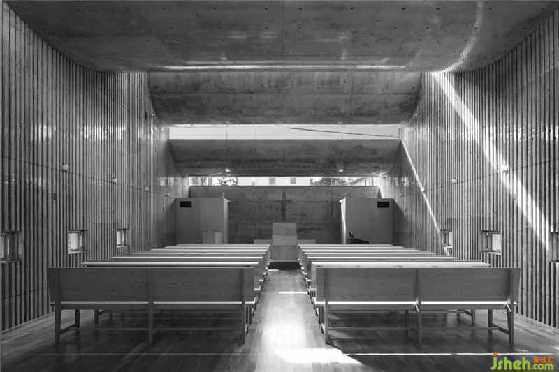 前廳屋頂?shù)脑O(shè)計呼應(yīng)建筑的立意,向上的形態(tài)引喻人們內(nèi)心深處,與生俱來對于天空的向往。端頭的天井及景觀設(shè)計與室內(nèi)的天花造型、屏風(fēng)圍合,共同形成一個極具儀式感的空間,引發(fā)人們對自然與天空向往的同時,向東方傳統(tǒng)人居思想致敬。