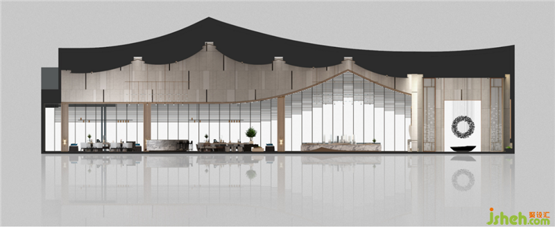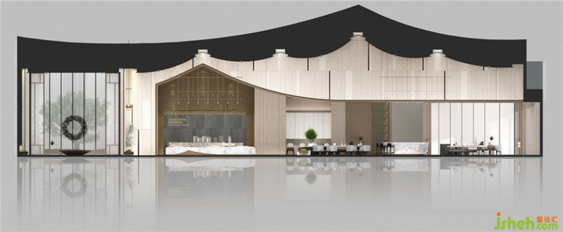 天花造型的靈感源于中國房屋的最初輪廓——瓦當(dāng),它象征著中國傳統(tǒng)建筑最根本的生活內(nèi)涵。結(jié)合出風(fēng)口,強(qiáng)化了形態(tài),使之更切合傳統(tǒng)屋頂結(jié)構(gòu)的意向,讓人在記憶中找尋回內(nèi)心深處對于家的最初印象。
