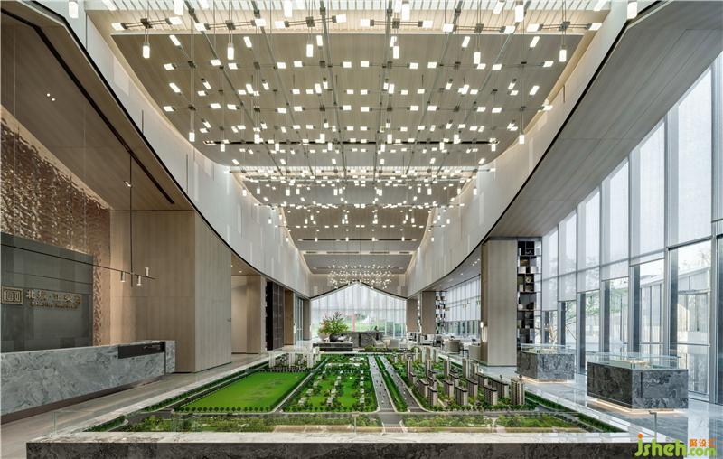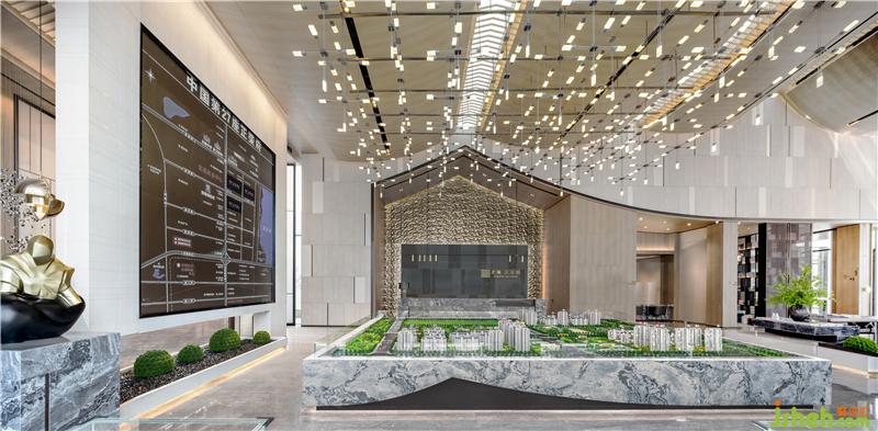 標(biāo)志性的幾何造型貫穿于空間當(dāng)中,從大筆觸的室內(nèi)結(jié)構(gòu)造型,到沙盤基座的大理石拼接紋樣等等,重復(fù)疊加使用,在人們的心中烙下強(qiáng)烈的印記。