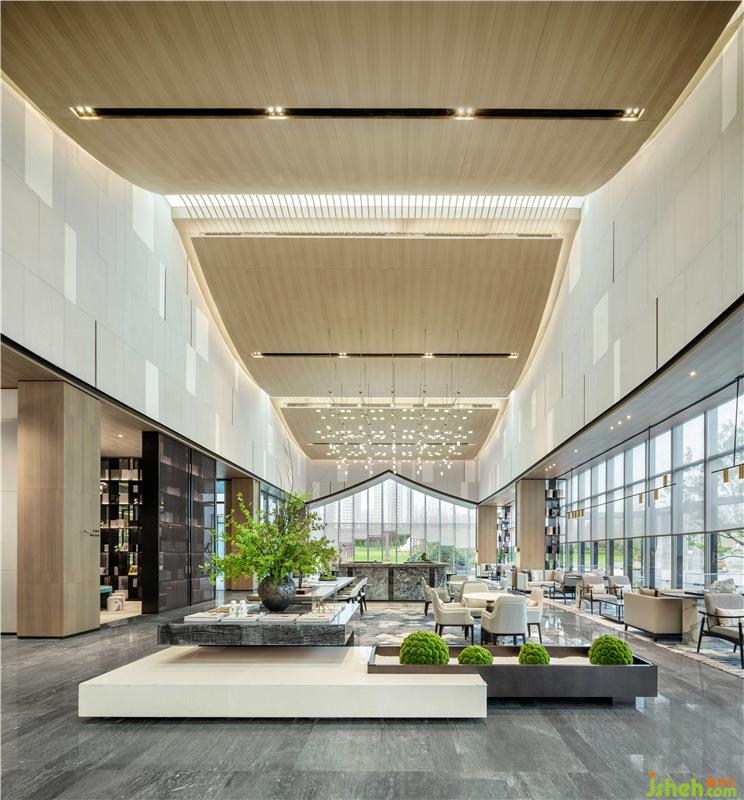 室內(nèi)立面為呼應(yīng)外立面幕墻也采用了人字形設(shè)計(jì),強(qiáng)化空間的對稱儀式感,讓整個(gè)空間感知渾然一體。