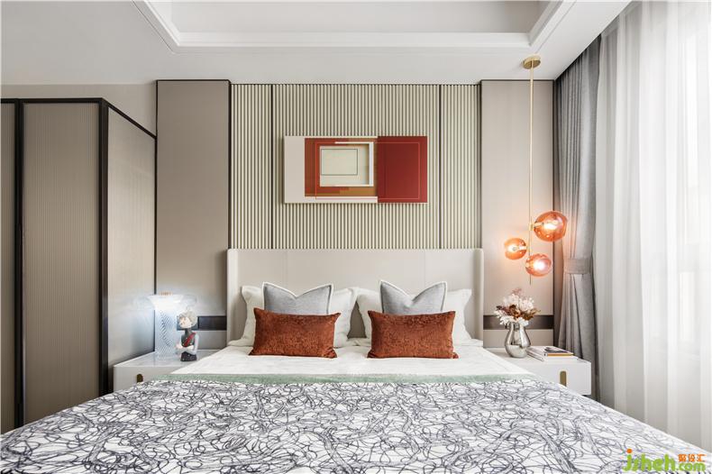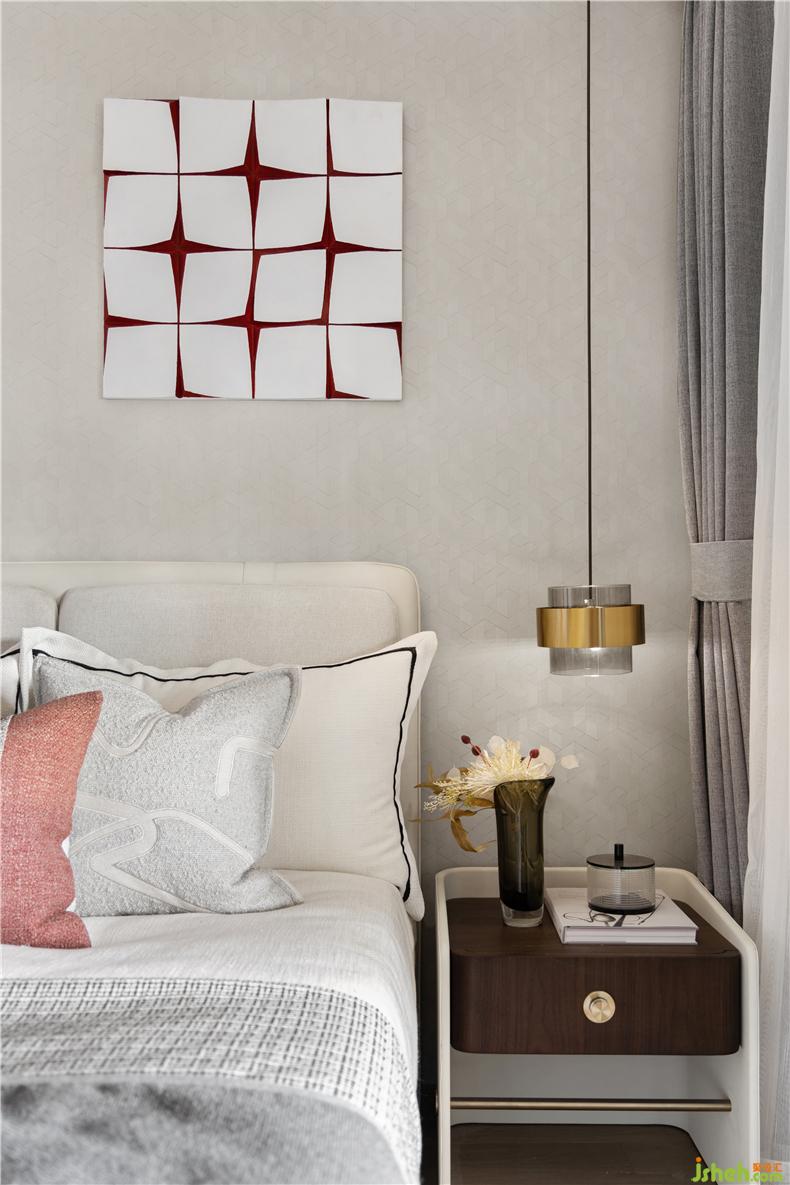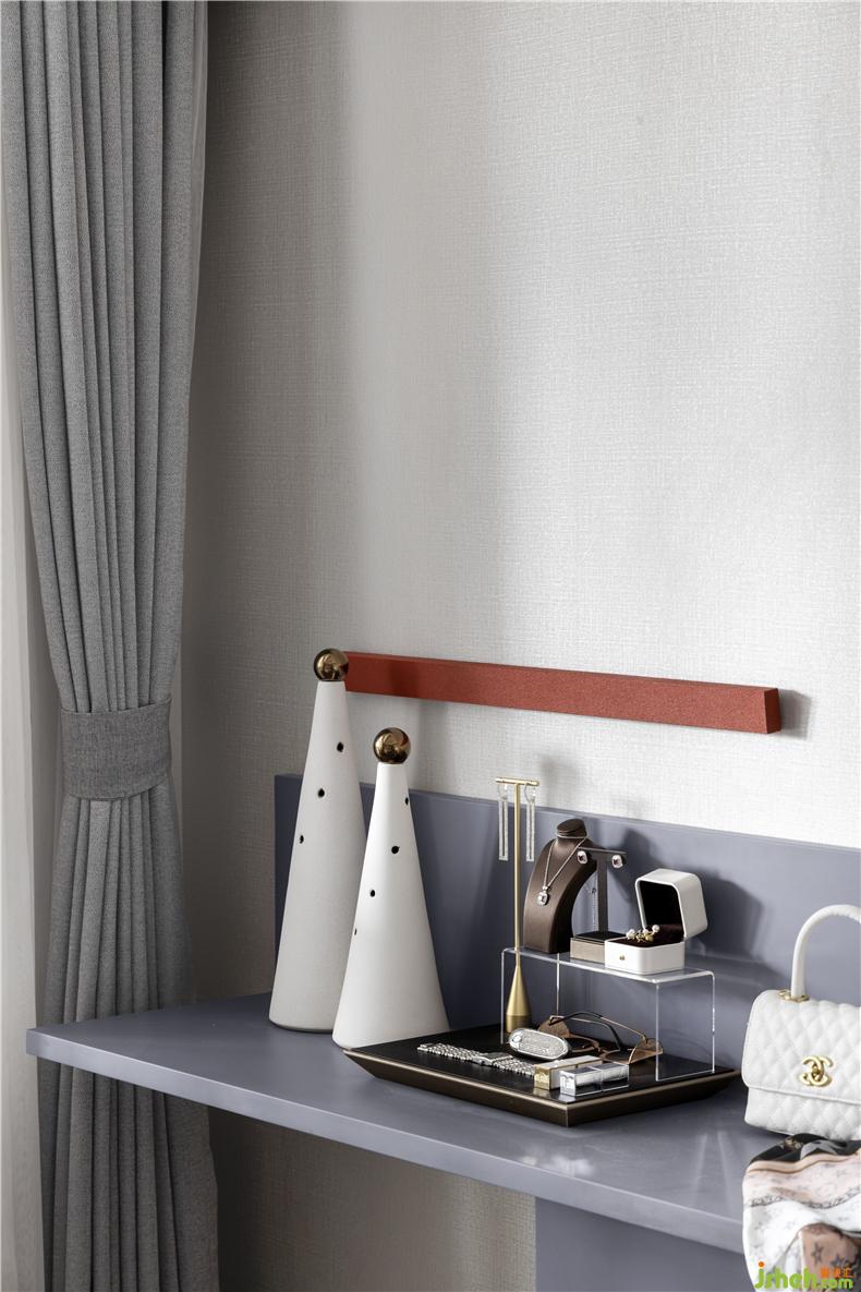 主臥運用莫蘭迪色系進行區(qū)域劃分,不爭不搶、不濃重、不妖嬈,高級又低調(diào)。梳妝臺墻面上升起滿月,仿佛在訴說著夜晚的浪漫。主臥不同材質(zhì)飾品與整個空間相得益彰樣板房設(shè)計。