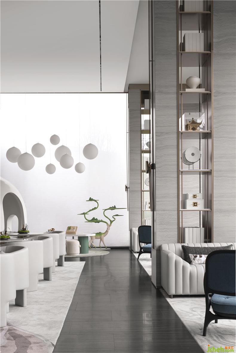 在洽談區(qū),將歸宿感推向極致。全力建造一個于自然間醉心風(fēng)月、休憩心靈的歸隱之處,倡導(dǎo)平和優(yōu)雅、蘊含慰藉的詩意生活。色調(diào)延續(xù)灰白色調(diào)為主之外,局部點綴的孔雀藍色和晚霞色,讓用戶重拾夕陽下靜止的樹枝、淡雅的花朵和呼吸的葉脈的感受;材質(zhì)延續(xù)以木質(zhì)、大理石和布藝為主,這是中華兒女居家空間中最為熟悉的材質(zhì),連結(jié)用戶歸宿的情感共鳴。
