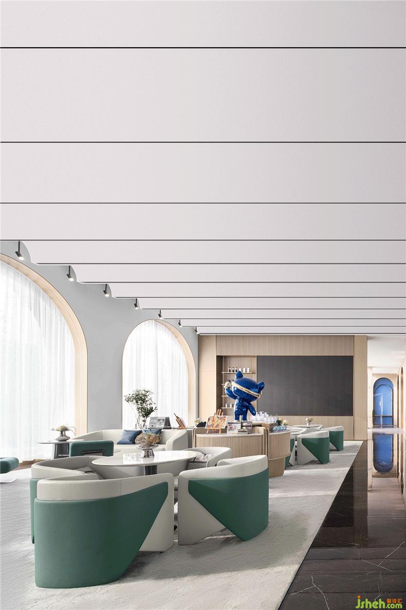 阜陽雙清江來項目售樓處本是一棟形似豪華酒店的獨立建筑,在承擔前期銷售功能的同時,為避免拆改帶來的浪費,后續(xù)將可持續(xù)使用作為社區(qū)配套空間。尚石設計通過“微笑”為社區(qū)更多互動留出可能,將社區(qū)活力在更有意思的場地空間里重塑新生。