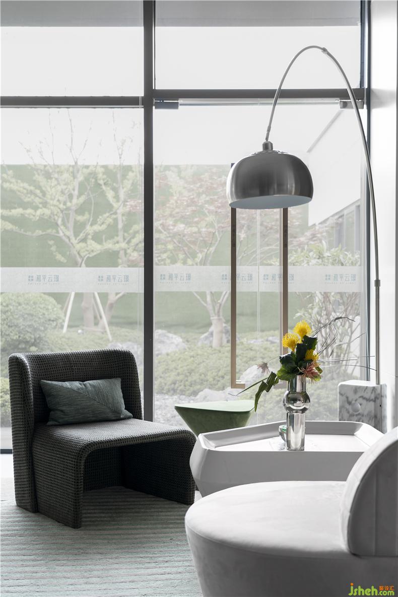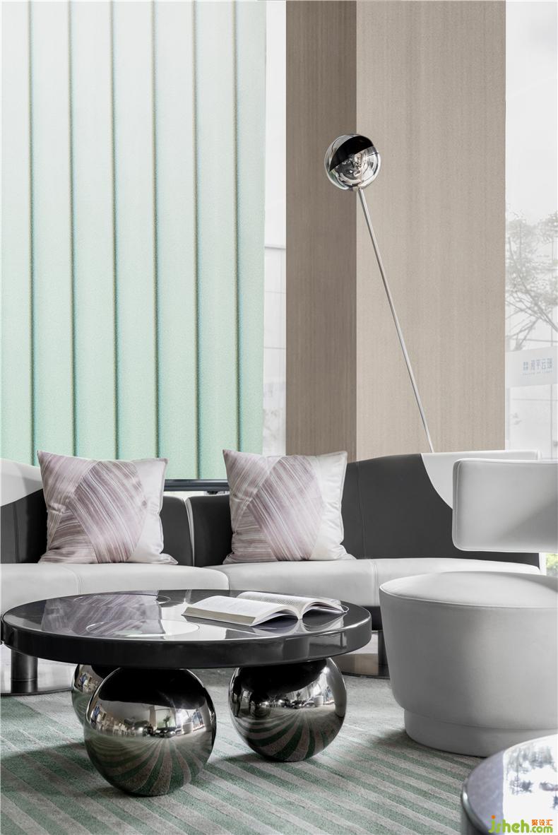 光線穿過綠色通透的亞克力,投在灰白相間的布藝沙發(fā)上。仿佛置身林間,一抬頭就能感受到灑在林蔭中的點點陽光