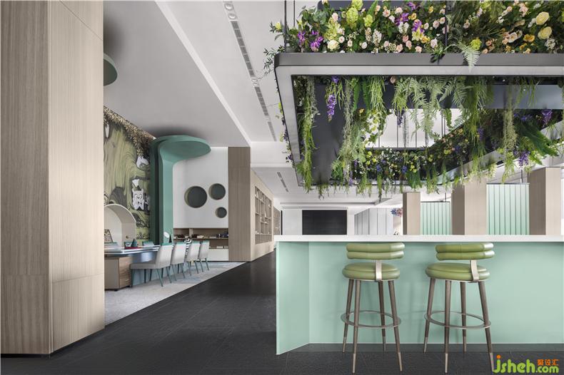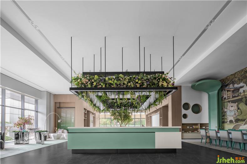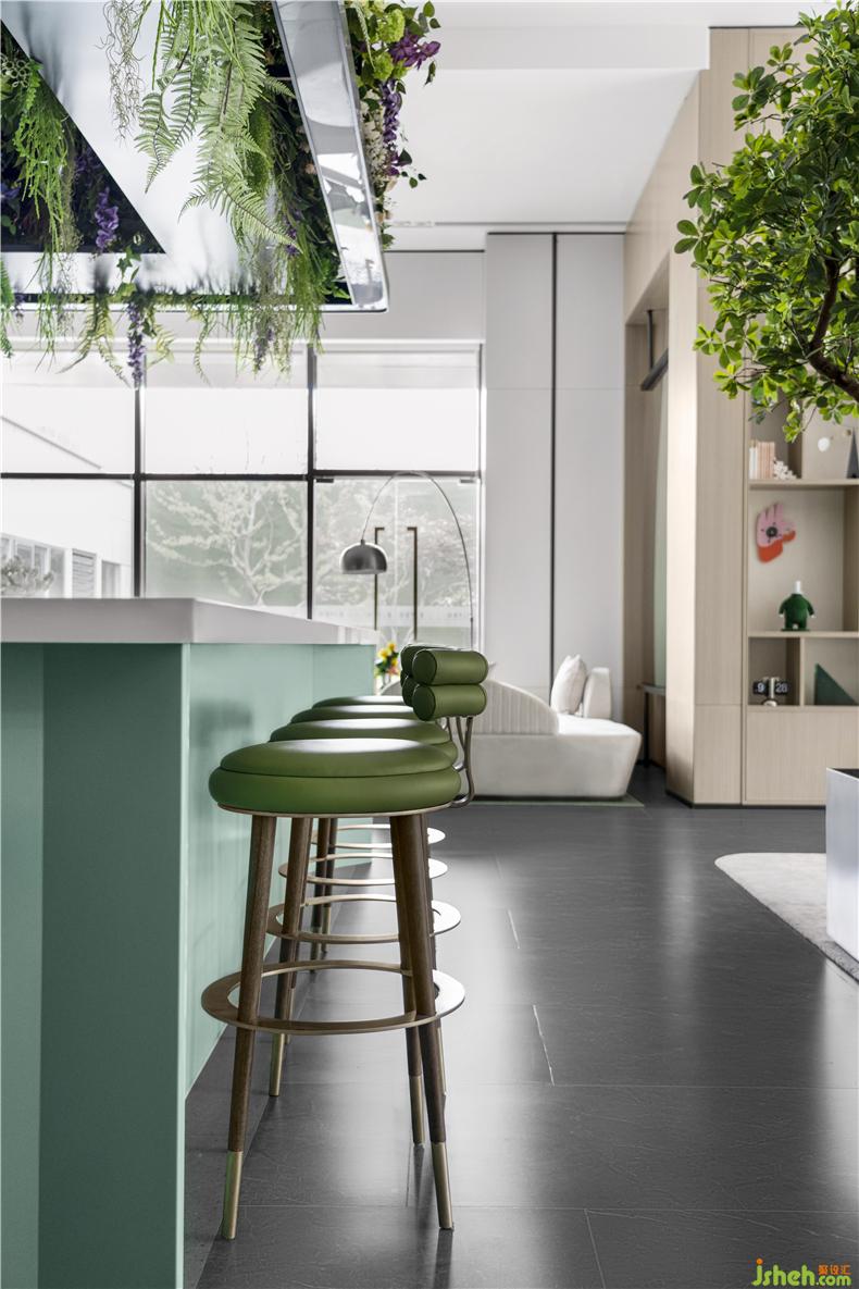共享廚房采用獨立體塊模式,售樓處裝修設(shè)計綠色烤漆材質(zhì)吧臺與綠色水磨石地面將其從整體空間跳脫出來。垂落下來的繁花與蕨類,隨風(fēng)輕輕搖動