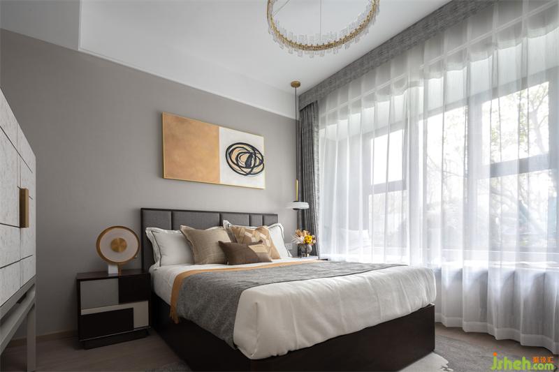 次臥簡潔寬敞,暖色床品打破線條的單調感,增加溫馨的氛圍。