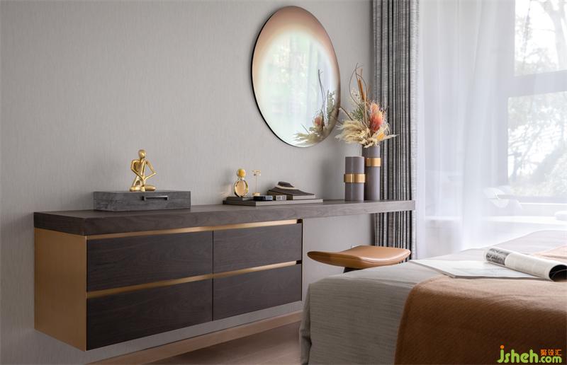 設置于床尾的梳妝臺是女主人每日裝點自己的區(qū)域,樣板房設計橢圓形的梳妝鏡使整體線條走向柔美。