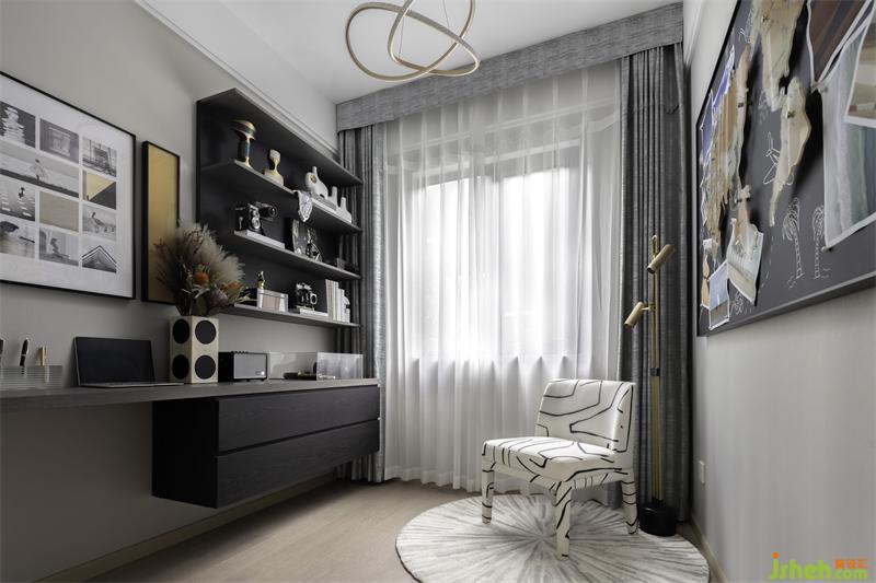 黑色線條在白色座椅上不經(jīng)意的構圖,與地墊相映成趣。樣板房設計不規(guī)則的金屬燈材亦能體現(xiàn)男主人非比尋常的審美情趣。