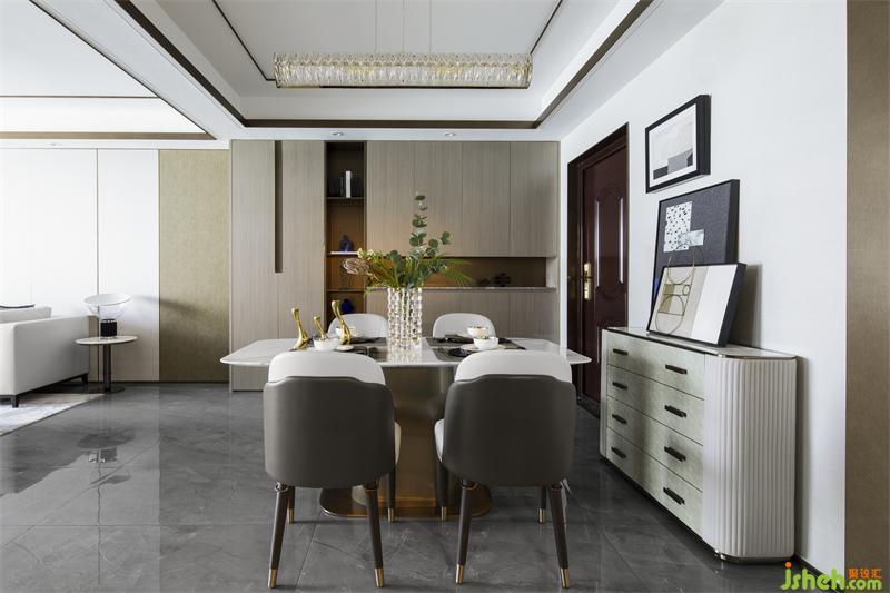 餐廳區(qū)域從傳統(tǒng)的空間配置中跳出,樣板房設(shè)計(jì)完成白色到米色的墻體柔和過(guò)渡。