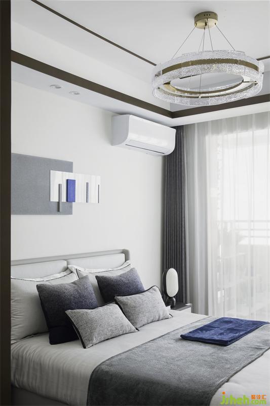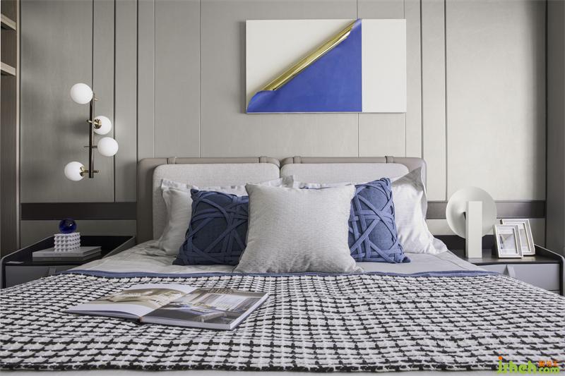 淺色系的主臥空間穿插不同層次藍(lán)色調(diào),樣板房設(shè)計(jì)營(yíng)造淡雅的氛圍。