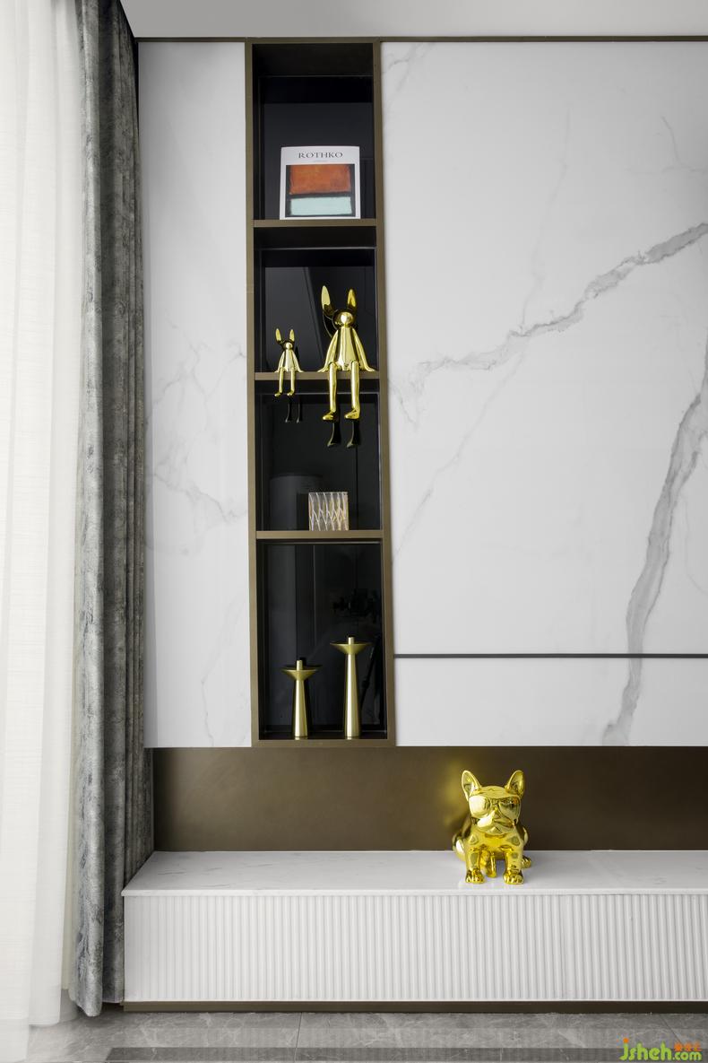 寥寥幾件金屬擺件,就能讓空間色彩對比更加鮮明。亦能從側(cè)面表現(xiàn)業(yè)主年輕而活潑的審美。樣板房設(shè)計