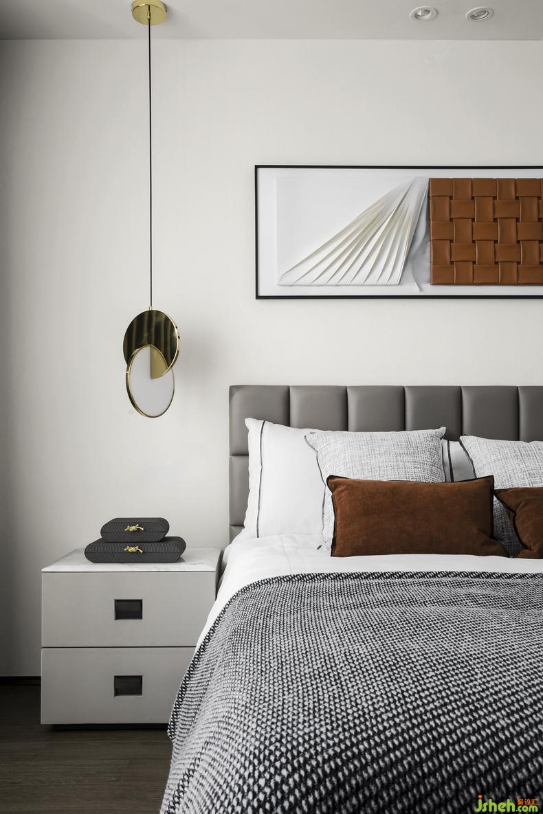 床頭掛畫的皮質(zhì)光澤與紙質(zhì)纖維的紋理,樣板房設計與亞克力材質(zhì)的床頭燈共同表現(xiàn)出豐富的層次。