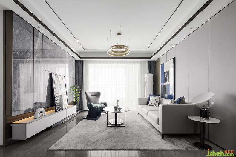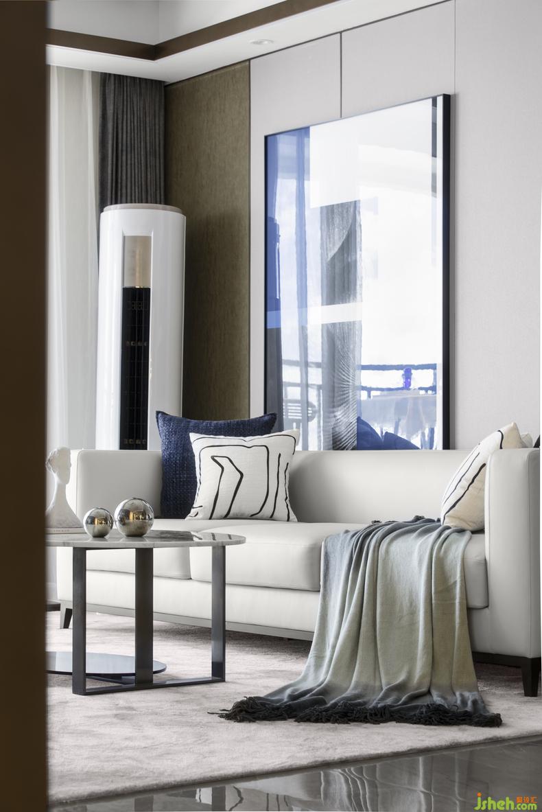 步入客廳,灰白藍(lán)的色彩組合盡顯高級(jí)感。
