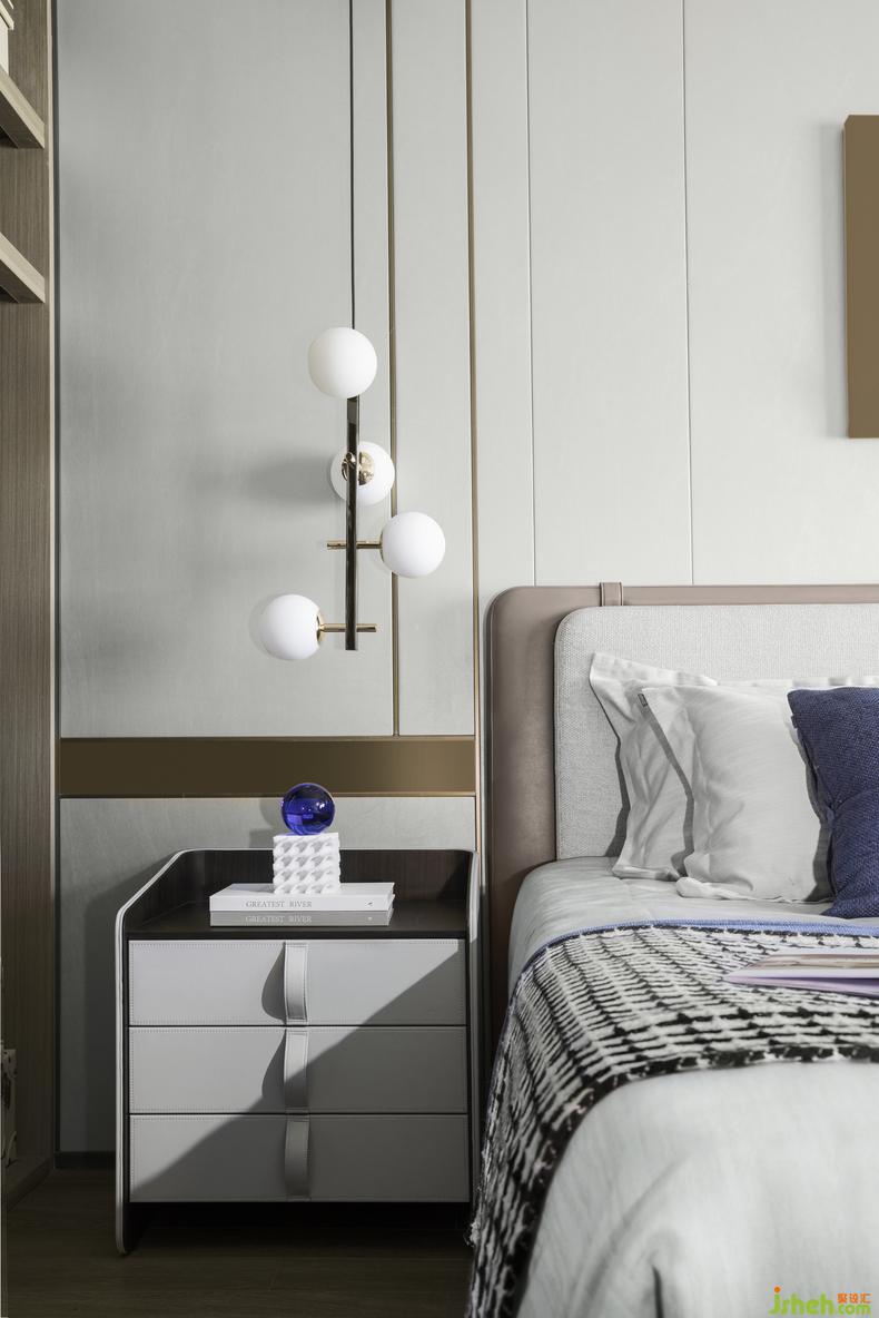 燈材也凸顯出精致感,玻璃包裹著金屬的光澤,樣板房設計使得整體空間典雅而帶著一絲微瀾的蕩漾。