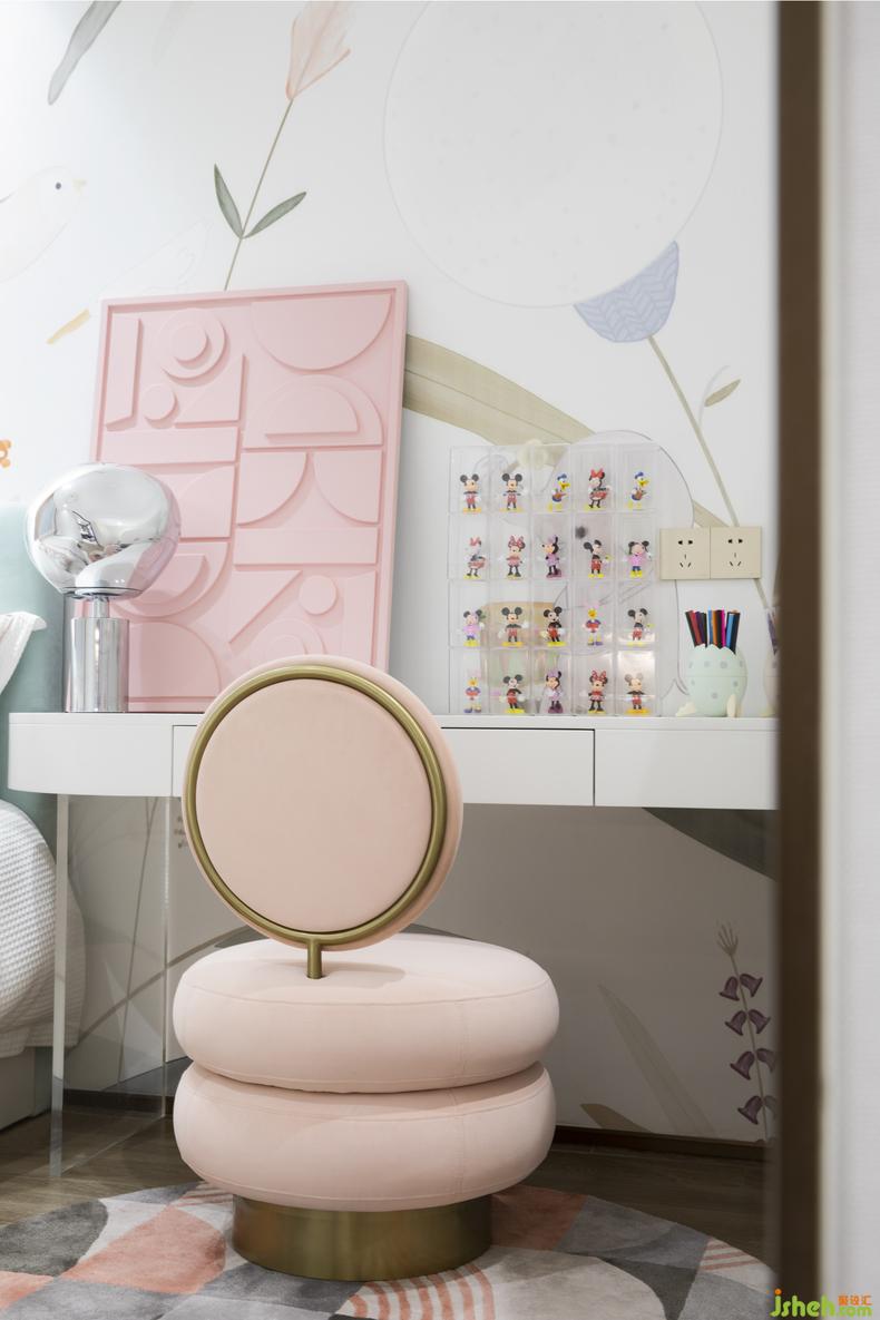 馬卡龍色系是女兒房的主調(diào)?;ú莶瀹孅c綴的墻面、樣板房設計浪漫粉色的幾何掛畫,都將天真爛漫的空間性格娓娓道來。