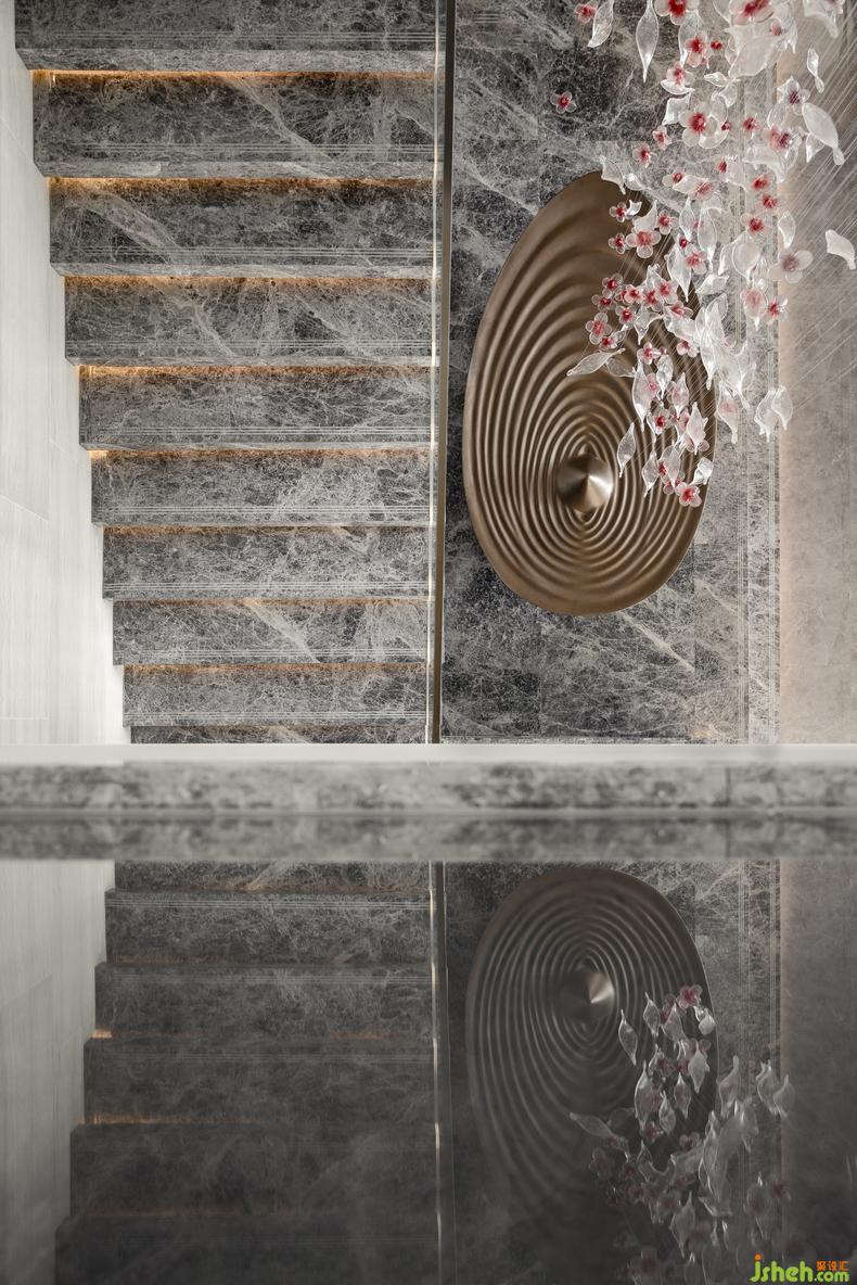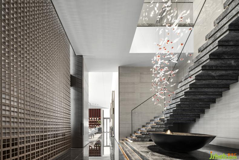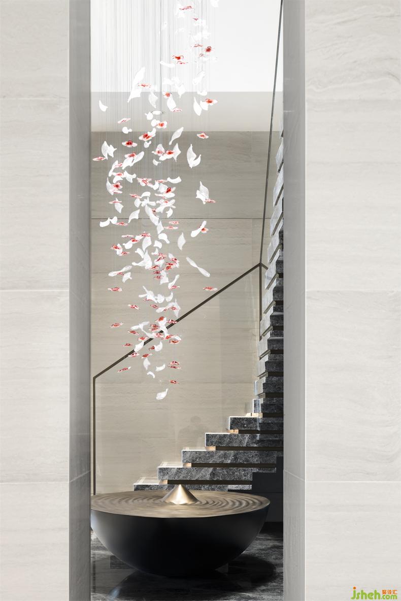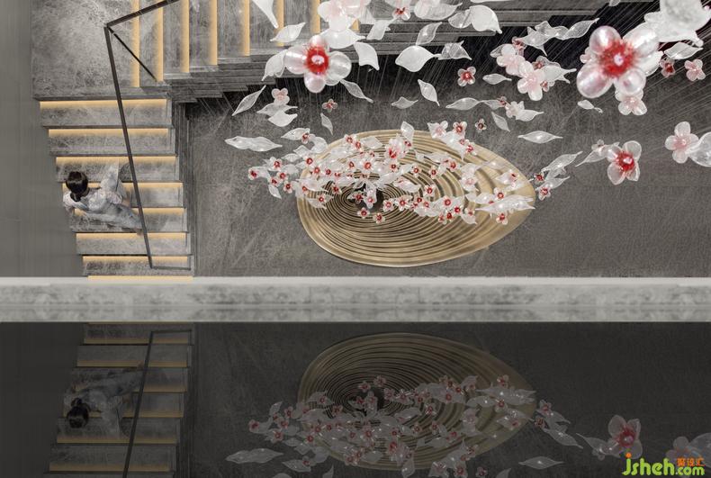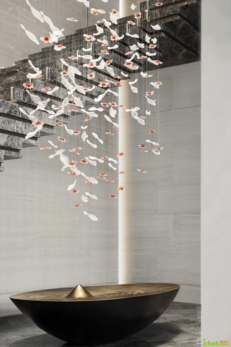 牡丹雕花墜飾和古銅金屬的水池裝置,凝聚著清雅朦朧的東方神韻。裝修設(shè)計(jì)雕花墜飾的透光工藝,使臨居深色水面上的牡丹看似更栩栩如生,吸引來往的人們對閑適自得的生活充滿遐想。