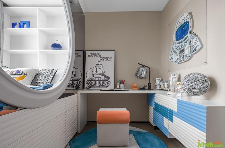 星戰(zhàn)主題兒童房給予暢想更多可能,充裕的學(xué)習(xí)區(qū)域?yàn)楹⒆犹峁┳杂傻奶剿骺臻g。