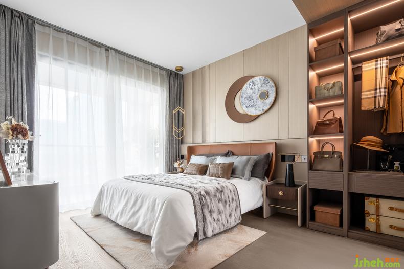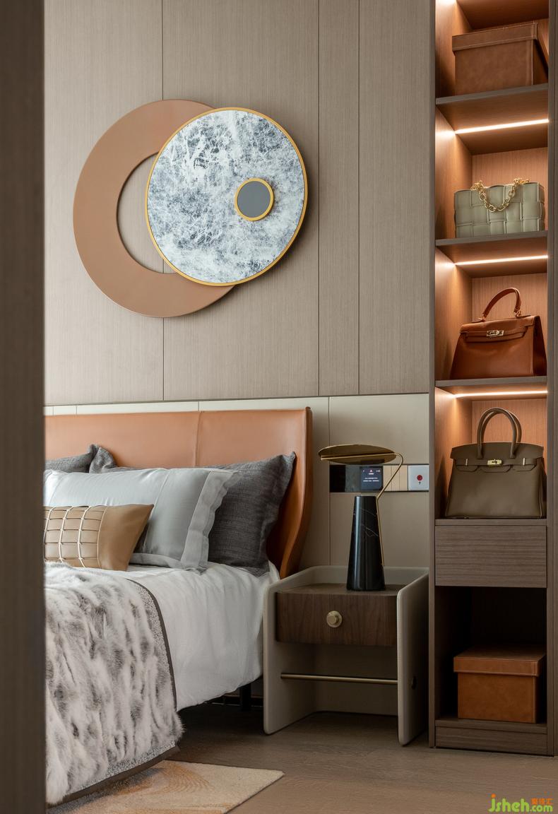 木質(zhì)護(hù)墻與大理石紋的墻面裝飾,在表達(dá)藝術(shù)審美的同時(shí),也將睡眠空間打磨得更加精致。