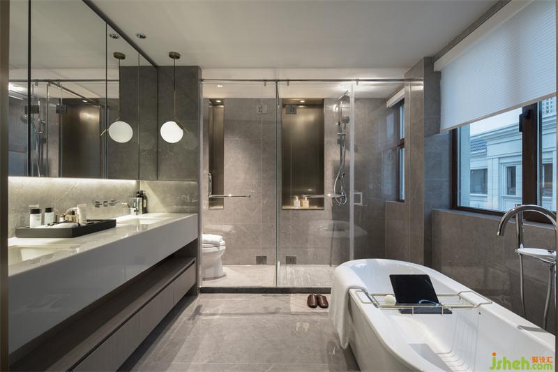 空間搭配上,浴室也絕不含糊。高級大氣的沉穩(wěn)灰色系,鏡面與巖板相嵌,暖黃色燈具打破灰調(diào)沉悶,讓空間展示精致摩登與沉穩(wěn)經(jīng)典的低調(diào)氣質(zhì)。