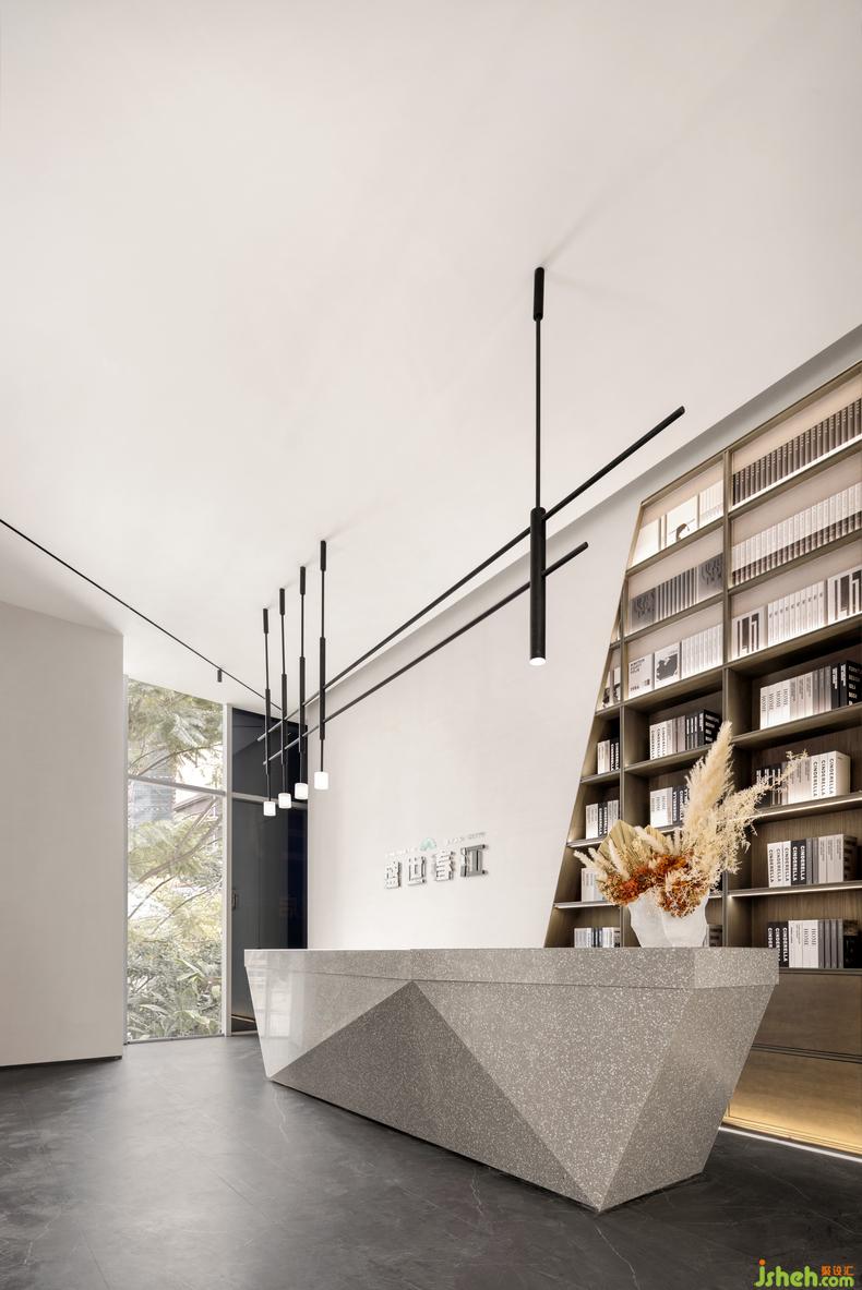 “納自然之形,建空間之意”,南寧的自然人文充分納入到設(shè)計(jì)之中。水磨石接待臺(tái)與上方的工業(yè)現(xiàn)代風(fēng)燈飾交相輝映,用線條鑄就力美表達(dá)。透過(guò)側(cè)面玻璃,望自由的綠植隨風(fēng)搖曳,自然和光影結(jié)于這一角,讓城市中的人們?cè)僖淮畏畔滦姆?,為這簡(jiǎn)與雅的共同體留駐。
