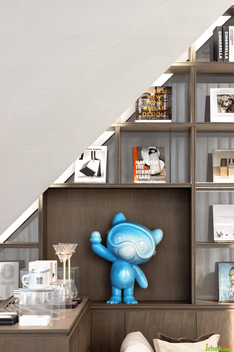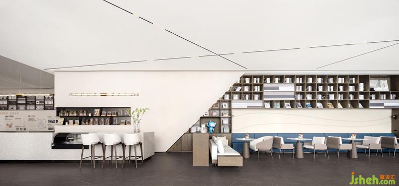 空間以灰與白之間的淺色色階為基調(diào),咖啡色作為書(shū)架底色,點(diǎn)綴藍(lán)色自然的清新質(zhì)感,打造敦厚溫暖而不失活力的體驗(yàn)場(chǎng)景。