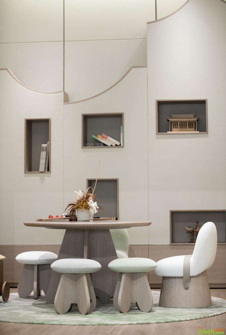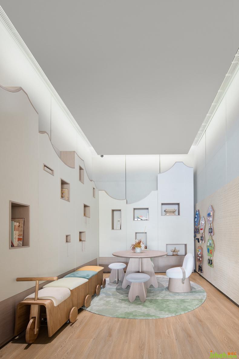 兒童區(qū)是孩子生活與傳統(tǒng)文化連接點(diǎn),售樓處設(shè)計(jì)墻體延伸宋代建筑群的形態(tài),收納國(guó)學(xué)經(jīng)典讀物和玩具。