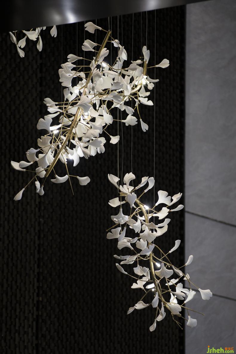 提取自新沂市樹「銀杏樹」,銀杏葉的化形拆解成為接待臺所懸掛燈飾的藝術(shù)結(jié)構(gòu)?;蜓由?、或綻放的有序形態(tài),自然元素與精神層面在此聚焦,新構(gòu)出獨(dú)樹一幟的藝術(shù)格調(diào)。