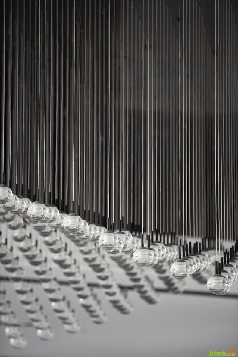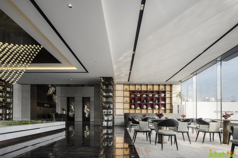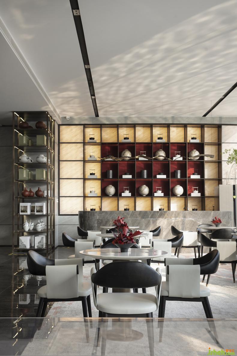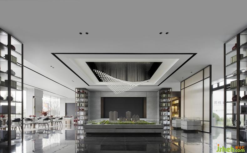 水吧延續(xù)這份古韻,整個空間在灰白色調(diào)上點(diǎn)綴丹秫跟金屬色,售樓處設(shè)計(jì)搭配出對比感極強(qiáng)的置物柜作為肌理分明的大理石吧臺背景。而上方懸空的藝術(shù)燈飾如同浩蕩水流,帶著人們感受空間的韻律感,將那故事娓娓道來。