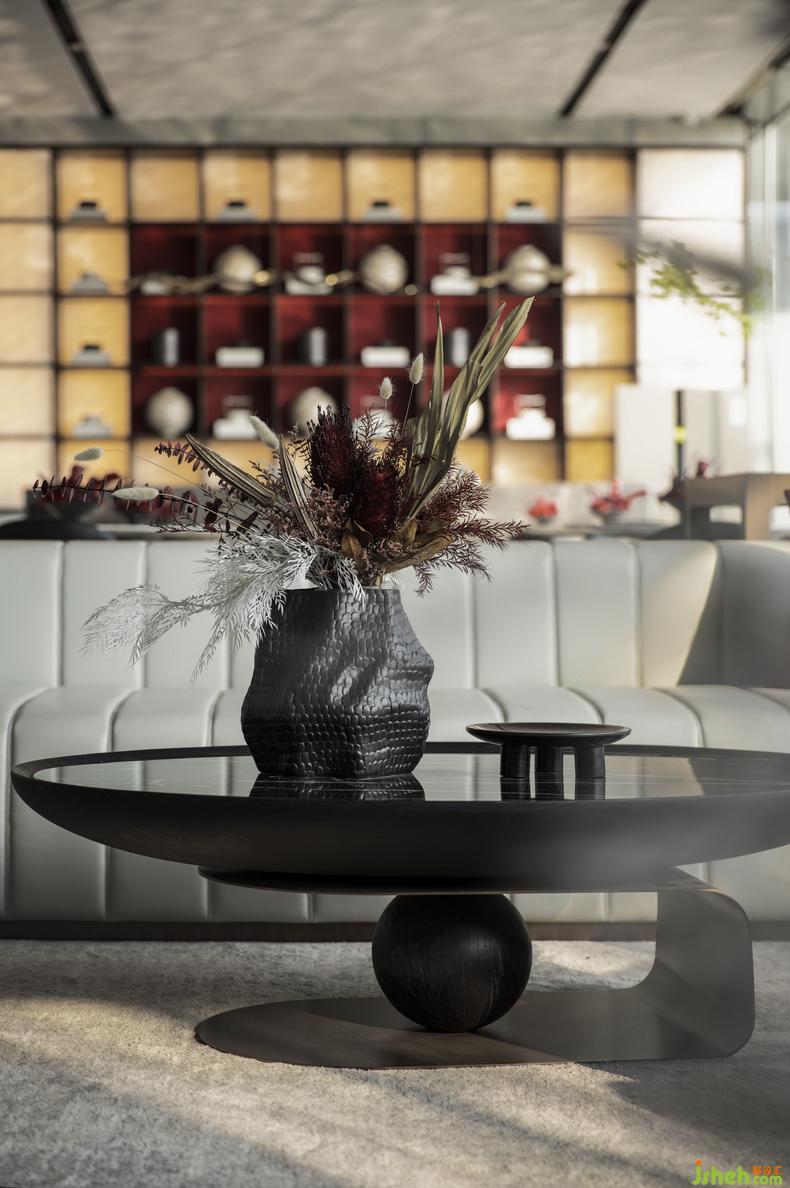 布藝沙發(fā)加入大量丹秫喚醒空間,搭配花瓶等物件增添細節(jié),為人們營造輕松從容,安靜包容而又瀟灑寫意的溫暖氛圍。