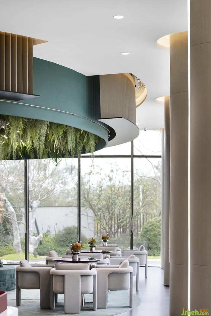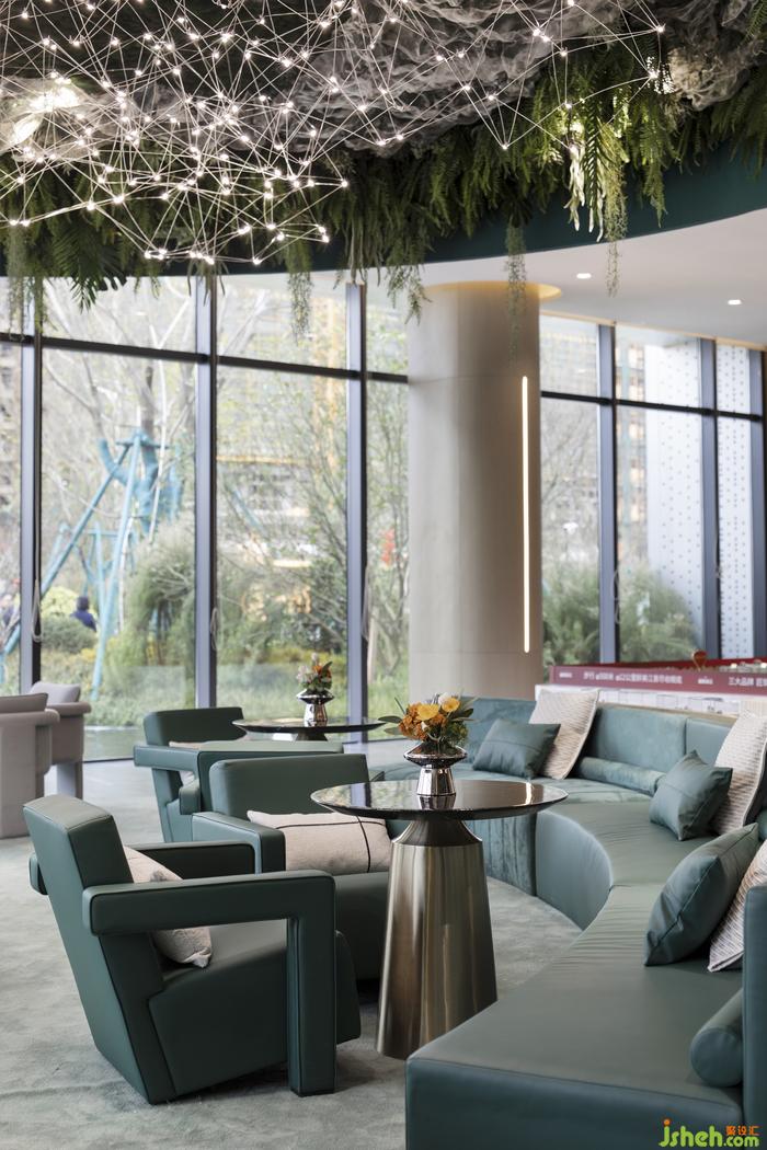 整體以木色為主基調(diào),搭配生機(jī)勃勃的翠綠喚醒空間,售樓處設(shè)計(jì)與淡雅的灰綠色家具相互呼應(yīng),在有限的空間里,形成自然與人居空間的滲透循環(huán),營造輕松舒適的洽談氛圍。