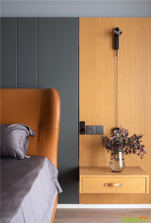 床頭柜是現(xiàn)場(chǎng)制作的,一個(gè)小壁燈垂下來,壁燈是可以調(diào)頭的。