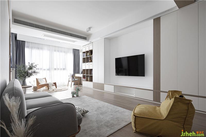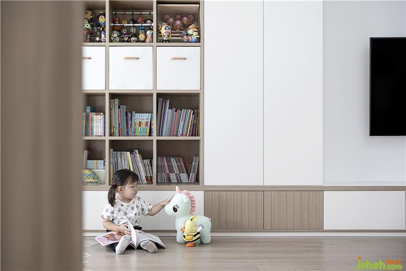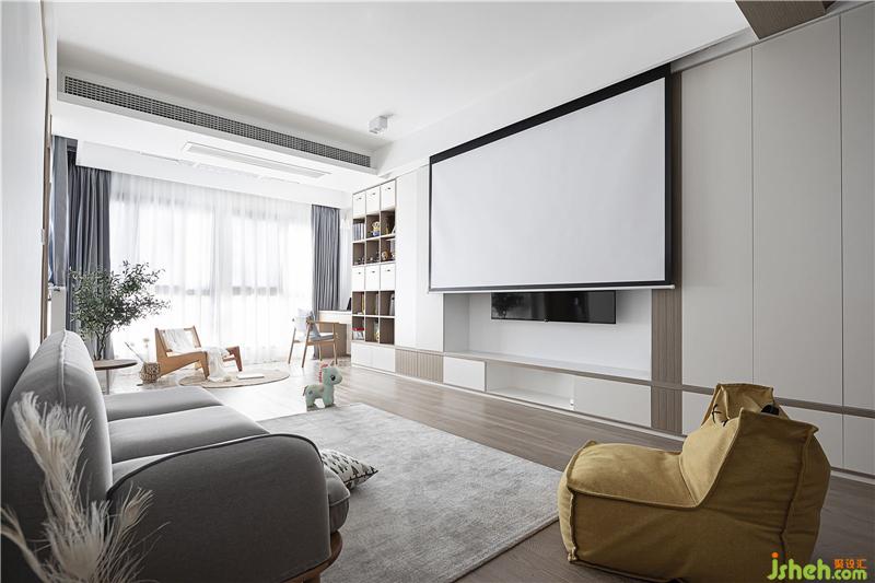 收納對(duì)于一家三代人來說太重要了。滿墻的柜子里面除了書,就是收納盒裝好的雜物。電視背景墻的柜子是白色模壓門,手按一下,門板就能彈開,比安裝門把手簡(jiǎn)潔又美觀。南京裝修設(shè)計(jì)客廳里還安裝了幕布,直接可以隱藏在吊頂里。有時(shí)候陪孩子靠在沙發(fā)上看看電影增進(jìn)親子關(guān)系也是極好的。