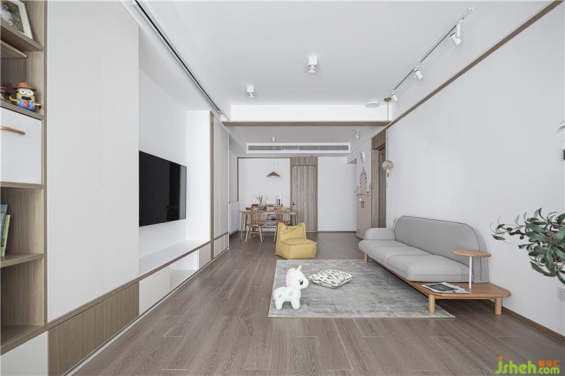 客廳里沒有茶幾,因?yàn)楹⒆酉鄬?duì)比較小,喜歡在家里跑來跑去, 如果茶幾放中間就相對(duì)礙事了。整個(gè)餐廳客廳都是選的地板材質(zhì),看起來溫馨一些,業(yè)主說,酷酷的家還是等孩子長(zhǎng)大以后裝修再弄,孩子小溫馨點(diǎn)更重要。