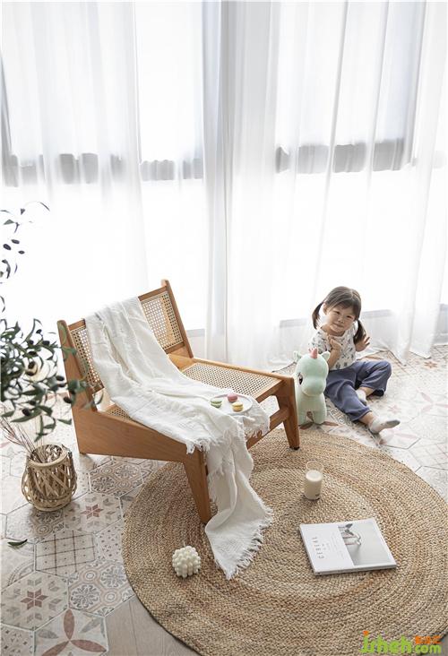 陽臺(tái)和客廳的結(jié)合,能讓空間看起來大了許多,這樣提供給孩子足夠玩耍瘋跑的空間。 原來陽臺(tái)是落地窗,采光也非常的好,因?yàn)闃情g距不是很大,站在陽臺(tái)就可以直視對(duì)面鄰居家的廚房,所以沒有選擇那種薄而透的白紗,業(yè)主通過和設(shè)計(jì)師一起挑選,選了稍微能遮擋隱私的紗,也能遮擋夏日陽光強(qiáng)烈的照射。 陽臺(tái)上放了一把木質(zhì)藤椅和圓形地毯,老人在孩子每天送去幼兒園以后,閑暇時(shí)就坐在這里看看書,曬曬太陽。偶爾也是小朋友愛玩的地方呢。 陽臺(tái)用了六邊磚和地板的拼接方式,美觀又實(shí)用。
