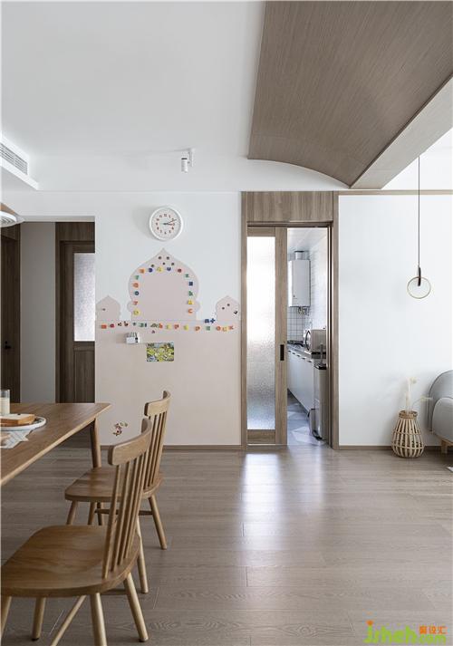 墻面上粉色的城堡造型是磁吸黑板墻哦,可以讓孩子用畫畫記錄開心的事情。 廚房的門采用木質(zhì)移門,擔(dān)心透明玻璃能看到廚房的雜亂,用了鉆石磨砂玻璃。 頂上的弧形造型頂使得整個(gè)空間柔和了。