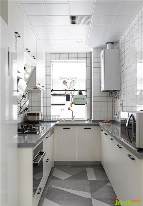 廚房里設(shè)計(jì)了U型柜,讓這個(gè)不大不小的廚房增加了很多收納空間。廚房的窗戶上裝了一個(gè)黑色桿子,這樣零散的物件就可以掛上去,也不影響采光,實(shí)用又不失美觀。柜子用了米色平板門配灰色石英石。非常的方便弄衛(wèi)生,一年365天,基本天天都在家里做飯,廚房的使用頻率實(shí)在是高,灰色的臺(tái)面相對(duì)來說比較方便打理。廚房墻面的磚用的是300*600的磚,上面有好多100*100的小方格子。
