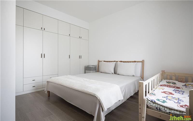 主臥的空間相對比較簡潔,滿墻的衣柜可以收納夫妻倆的所以衣物。南京裝修設計旁邊的小床是孩子睡的,方便晚上照顧小朋友起夜。