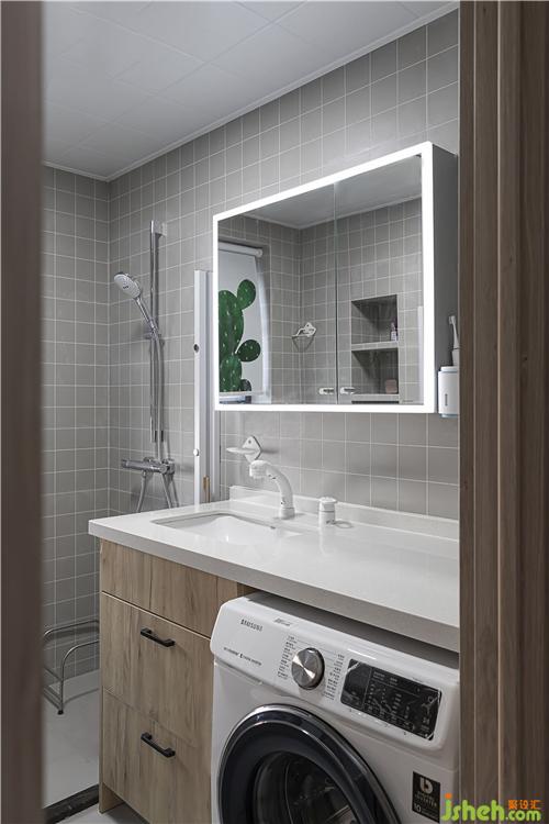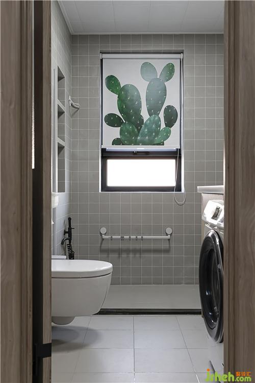 陽臺納入了客廳后,不適合放洗衣機,因此把洗衣烘干一體機放進了衛(wèi)生間里。衛(wèi)生間窗戶的簾子是綠色的仙人掌圖案,小小的俏皮可愛。