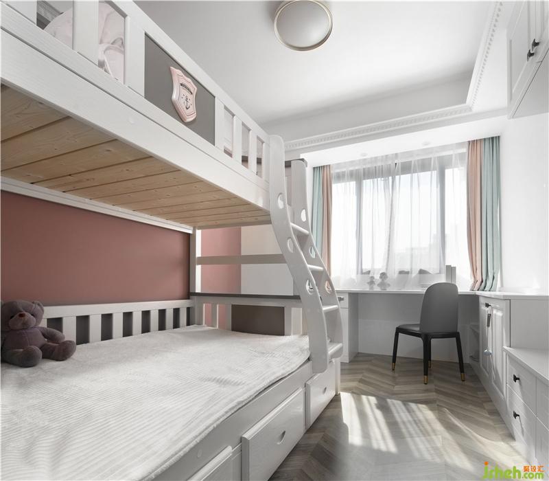 暗粉色的墻面漆搭配了白色的高低床,一猜就知道是小女孩的房間。書(shū)桌那邊原來(lái)是飄窗的位置。