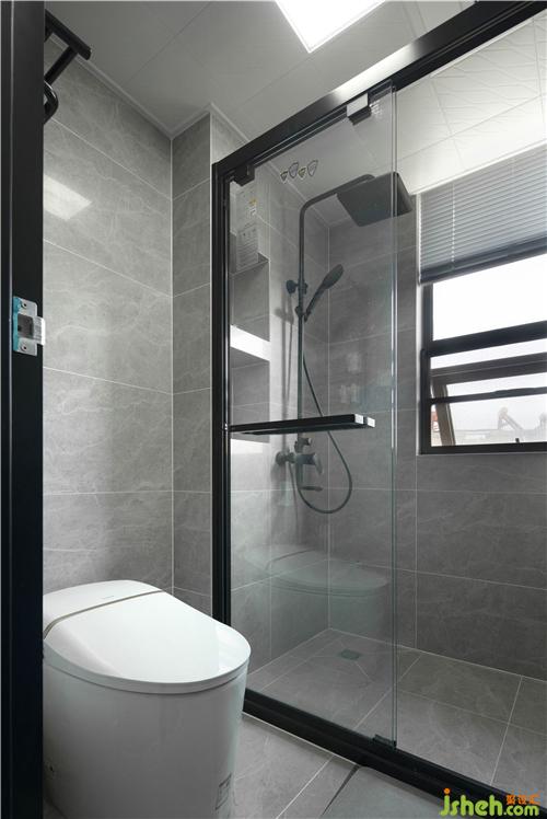 這是客衛(wèi)的照片,墻地磚顏色一體,灰色系。淋浴間有個(gè)壁龕可以放沐浴乳之類(lèi)的哦。